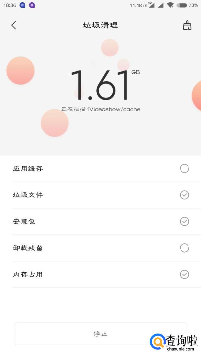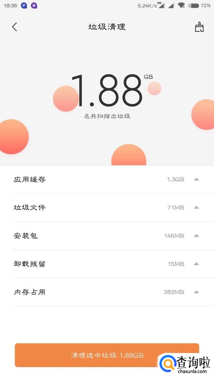 等待手机自动扫描垃圾,然后点击“清除选中垃圾”。