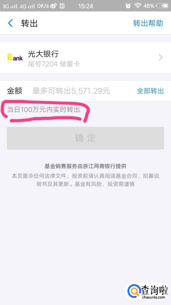 回到余利宝可以看到主页面,点击转出,余利宝可以转入自己银行卡里和支付宝账户里,并且免费提现额度为100万,对很多人来说相当于无限量提现了。