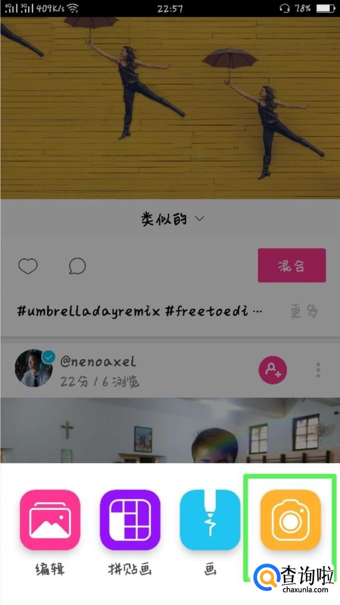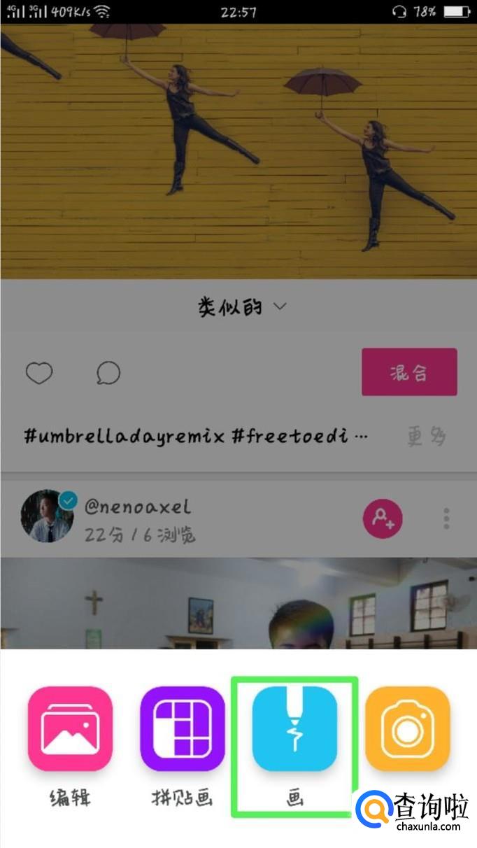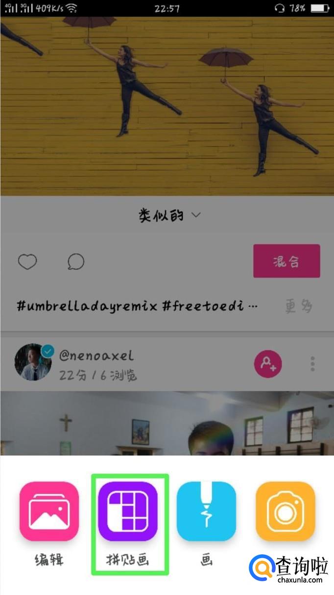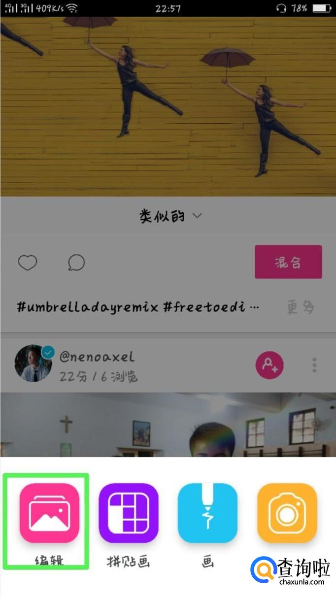 点击中间的“+”符号,然后就会出现四个图标:编辑、拼贴画、画和相机。我们按顺序先看编辑。
