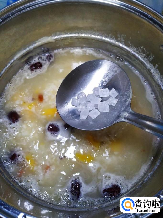 盖上锅盖,大火将水烧开,水开后,转小火煮20分钟左右,煮至汤汁浓稠后,加入适量冰糖,再煮五分钟左右。
