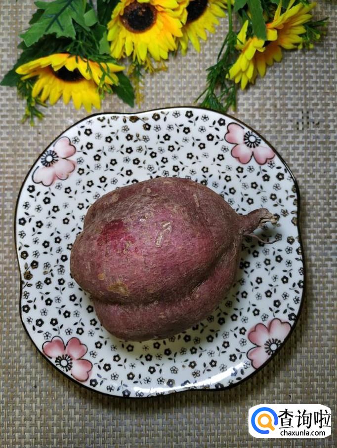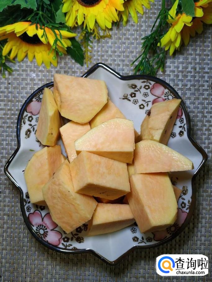 准备一个红薯,洗净后去皮,切成小块,放入锅中,一起煮。