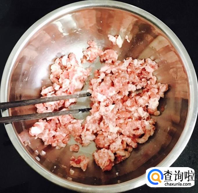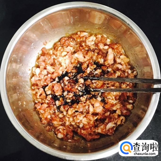 肥瘦相间的猪肉剁成肉馅放入容器中加入适量的花生油、香油、料酒、蚝油,盐,生抽搅拌均匀