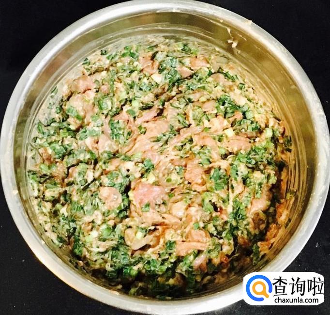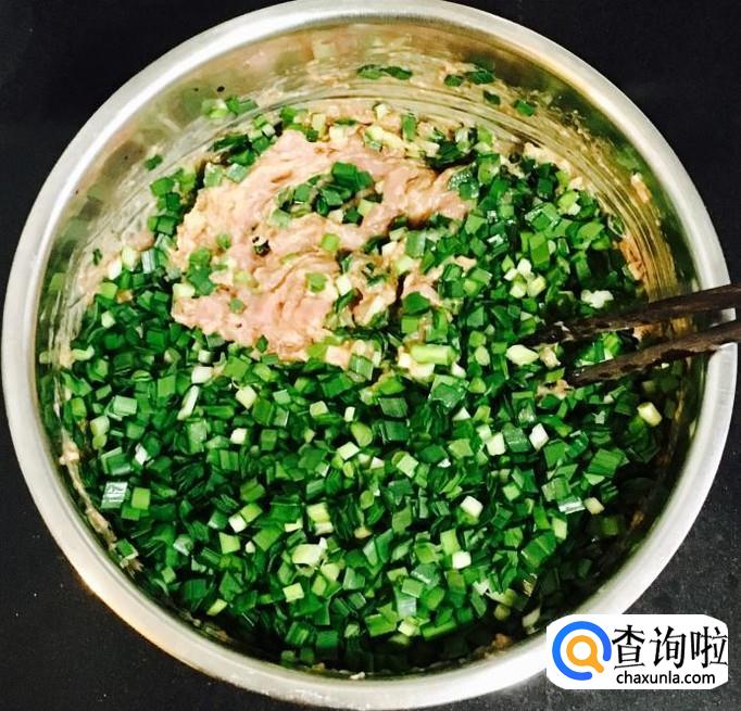 把切好的海肠和韭菜放入盛有肉馅的容器中搅拌均匀即可