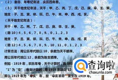 地支:年份÷12,得到的商不管,看余数,若余数-3得正,则按地支顺序往下数,得数即为地支顺序数。若余数-3为负,则+12,得到的数即为地支顺序数,若余数为3,则为地支的最后一位,即亥。