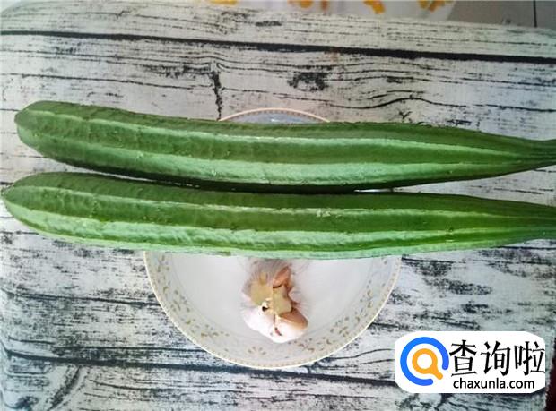 准备好所有材料:两根新鲜嫩绿的丝瓜、一个蒜头。