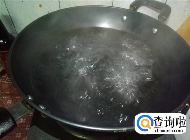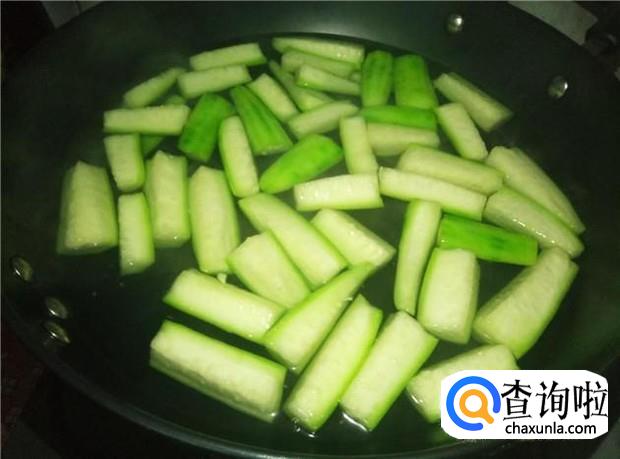 锅里烧开一锅水,水开后倒入丝瓜,上下翻转丝瓜,均匀受热。