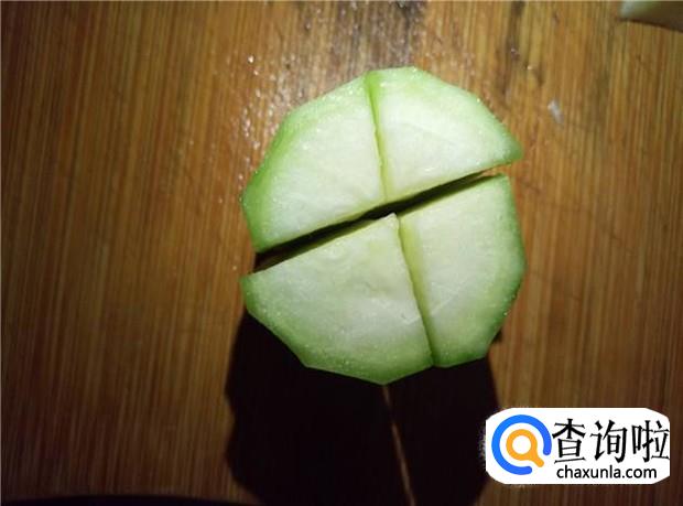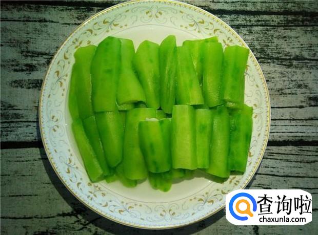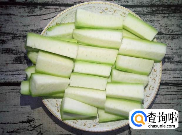 丝瓜削皮,轻轻把皮削开就可以了,保留表皮的一点绿色,不要削太深。