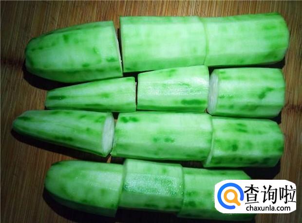 丝瓜削皮后,清洗干净,先切成一段段,再对角切成四方块,备用。