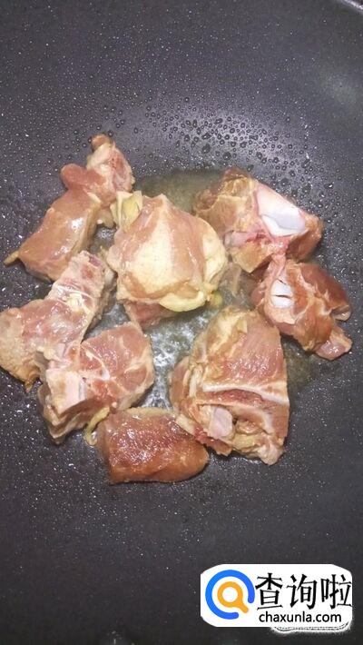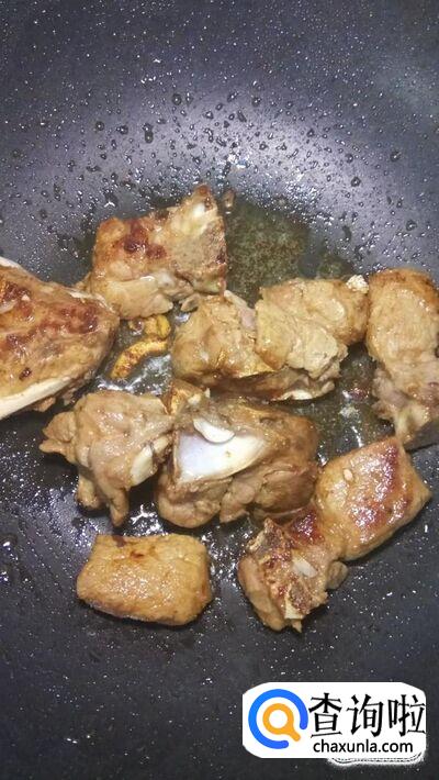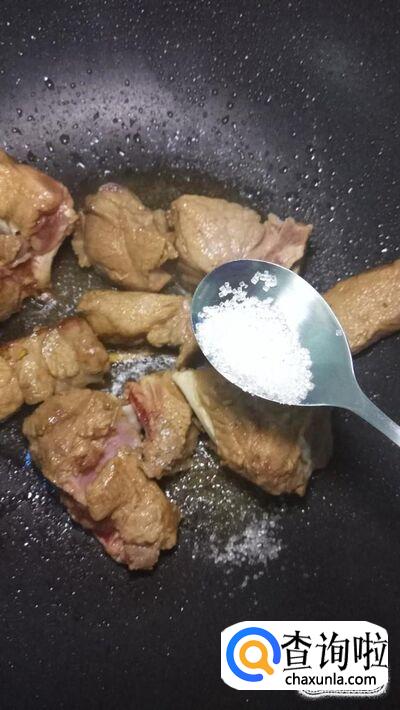画中放入适量油,倒入排骨,煎至两面金黄,再加少许白砂糖增色和提鲜。