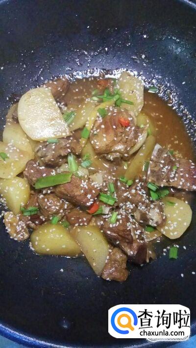 再炖十分钟左右,等土豆熟之后,撒入适量白芝麻,再撒适量蒜苗碎和辣椒圈。