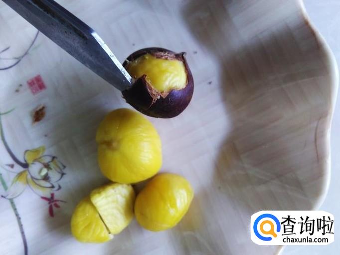 或者用小刀也可以,先用刀尖在板栗缝撬开,然后很容易就能撕出那层皮了,而且这样去皮的板栗色泽还非常鲜艳。