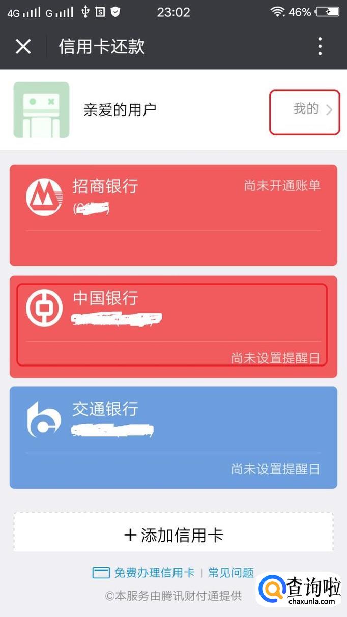 比如说,我要把图中中国银行的信用卡删掉,点击图中“我的”选项。