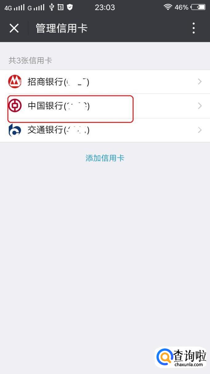 出现如下的界面,我们点击“管理信用卡”按钮,然后点击选中对应的“中国银行信用卡”。