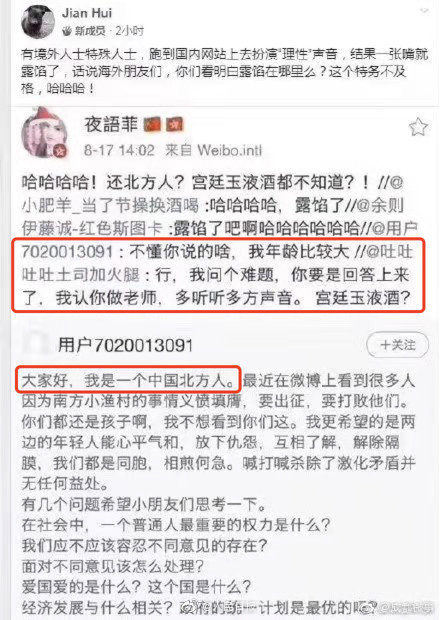 事情是这样的,一个自称“中国北方人”的家伙在微博上夸夸其谈,发表所谓“理性”观点。网友@吐吐吐吐土司加火腿提出一个问题,表示对方如果能答上来,就认他做老师,问题很简单:“宫廷玉液酒?”