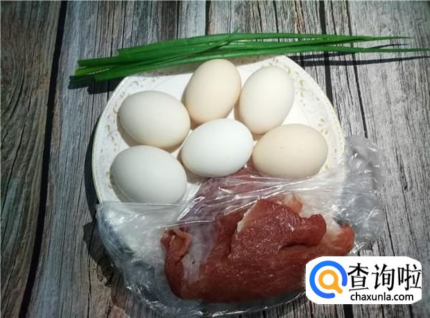 准备好六个土鸡蛋、瘦肉半斤、葱两根、姜一块。