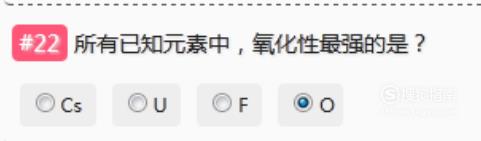 所有已知元素中,氧化性最强的是“O”。
