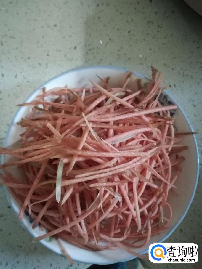 将胡萝卜用清水洗干净,切成细丝装碗备用。