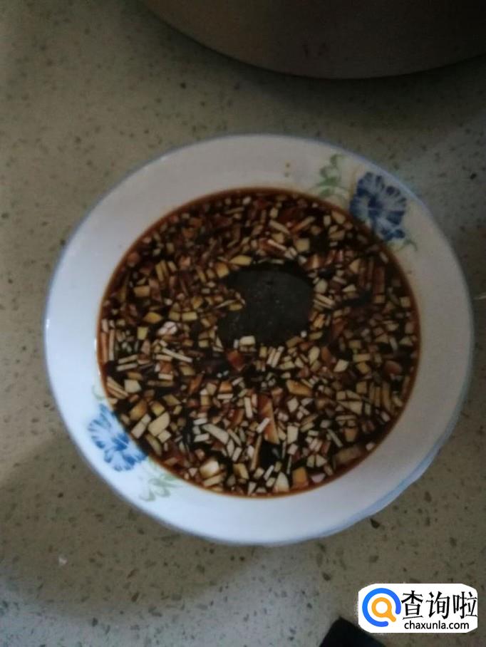 接着洗干净一个盘子,倒入适量的生抽酱油,加入切好的姜蒜粒加入盘中,然后加入盐,花椒油等作料,用筷子调匀,尝试下味道,觉得合适,就放在一边备用。