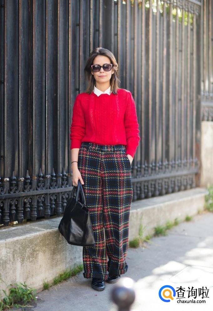 大红色毛衣配阔腿裤。这种搭配比较适合身高比较高的女性,阔腿裤非常有范儿,配上一件大红色毛衣,简直气场满满。