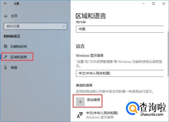 弹出的界面,我们点击区域和语言,然后我们点击添加语言;