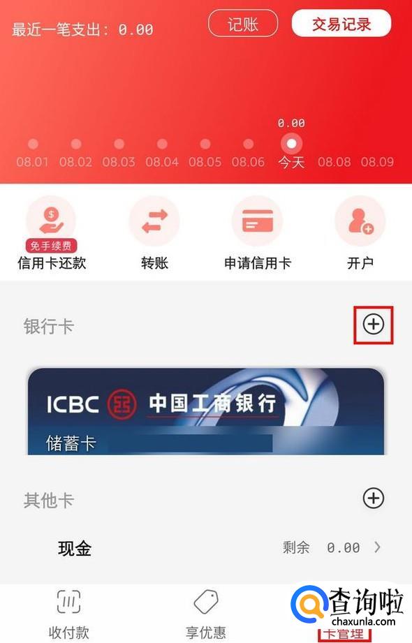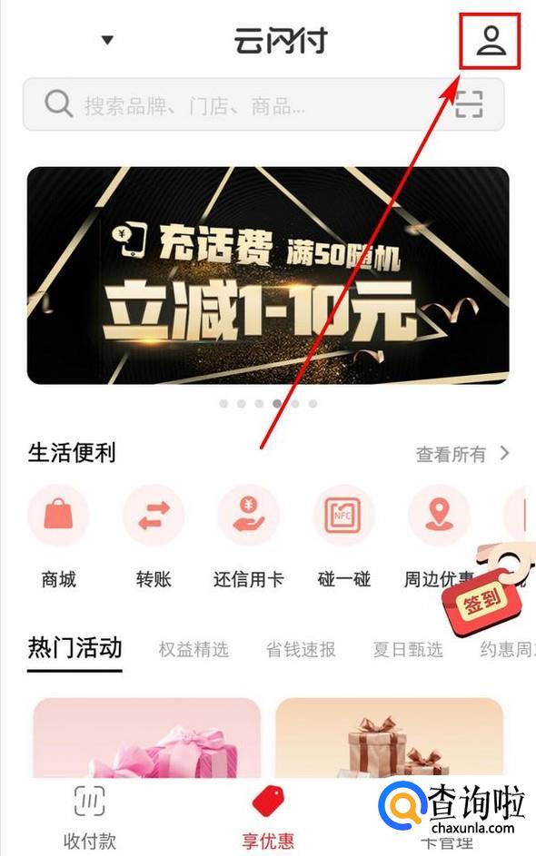 打开APP后,首页是“享优惠”,其他两个页面是收付款和卡管理,点击右上角的人形图标;