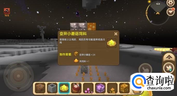 普通的鸡在食用变异小蘑菇饲料后,有几率变异成战斗鸡,如图所示。