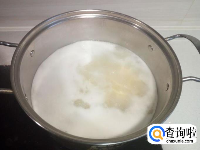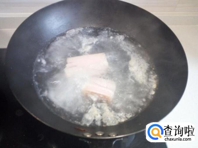 五花肉用水清洗干净,放入锅中煮十多分钟,然后捞出,切成片,备用。