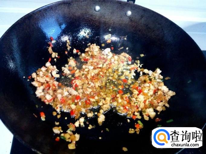 锅内放入油加热,油热后放入肉末翻炒,然后放入葱姜,榨菜,辣椒末。