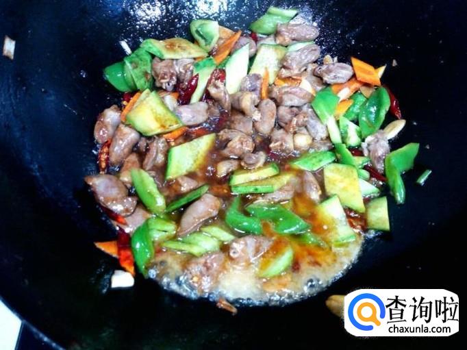 黄瓜片,青尖椒片略翻炒一下,随即放入炒好的鸡心翻炒。炒至鸡心沾满料汁后,倒入勾兑好的芡汁。