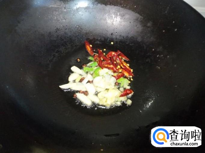 锅内重新放入油加热,油热后放入花椒,红干椒,葱,姜,蒜,爆香。放入红萝卜片翻炒至变软。