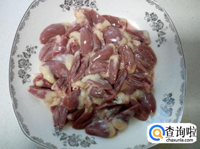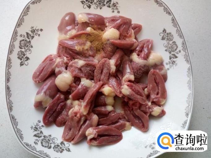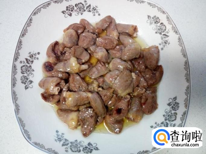 鸡心用水清洗干净,控干水分,切成对半。去除上面的血管,血块,放入少许盐,料酒,五香粉,腌制20分钟。