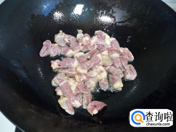 锅内放入油加热,油热后放入鸡心翻炒,炒至八分熟,盛出备用。