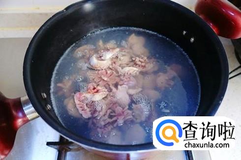 锅里烧开水之后,把鸡胗放进去焯水,鸡胗变色之后捞出来。
