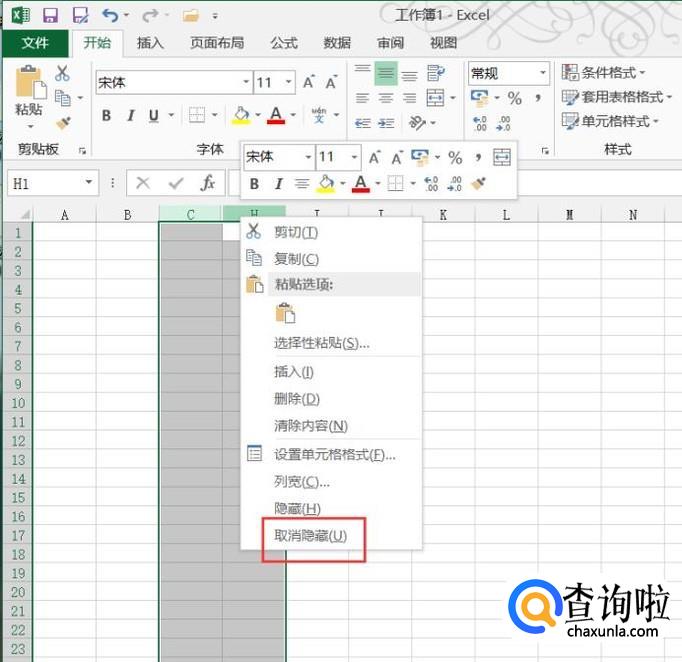 右键单击被选中区域,点击弹出菜单中的“取消隐藏”。