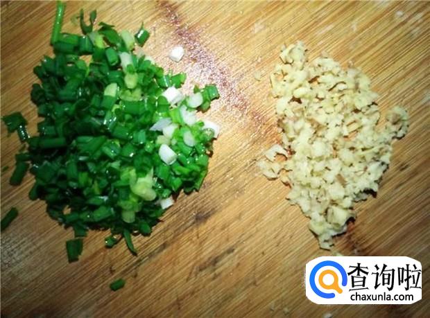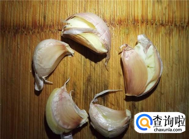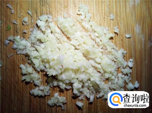 蒜头五颗,用刀背拍扁,剁成蒜蓉,备用。