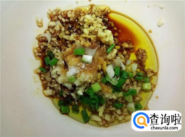把蒜蓉、姜末、葱末,一起加入碗里,再加入适量的盐、花生油、酱油、蚝油,搅拌均匀,盐可以稍微放多一些,因为苦瓜会蒸出一部分的水分。
