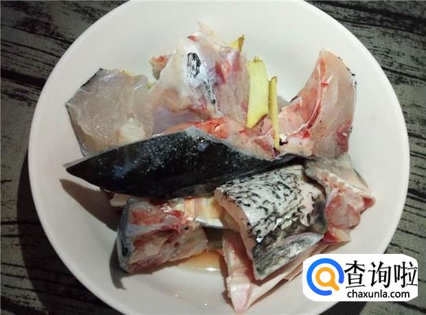 鱼头清洗干净,加入适量的姜丝、料酒,腌制一会。