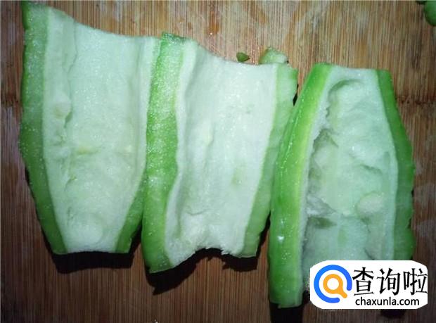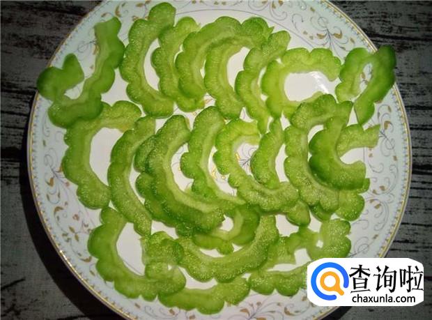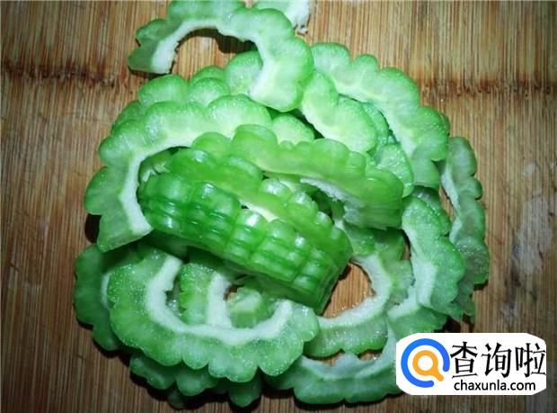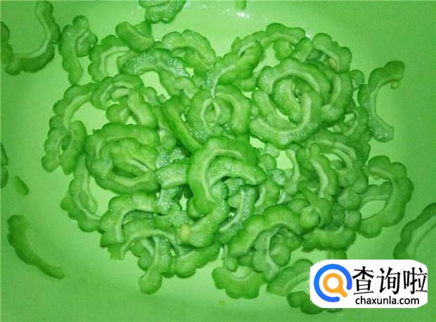 苦瓜去掉瓜囊,切成薄片,加入适量的盐,搓洗两遍,可以把苦味给去掉一点。
