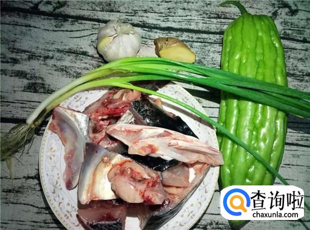 鱼头、苦瓜、蒜头、姜、葱、花生油、酱油、蚝油、料酒