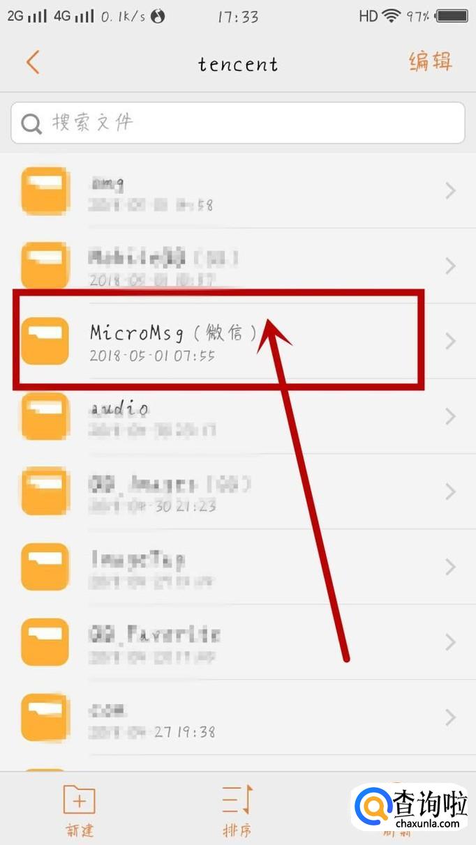在“tencent”文件页面,找到存放与微信相关的文件夹“MicroMsg”点击并进入,如图所示。