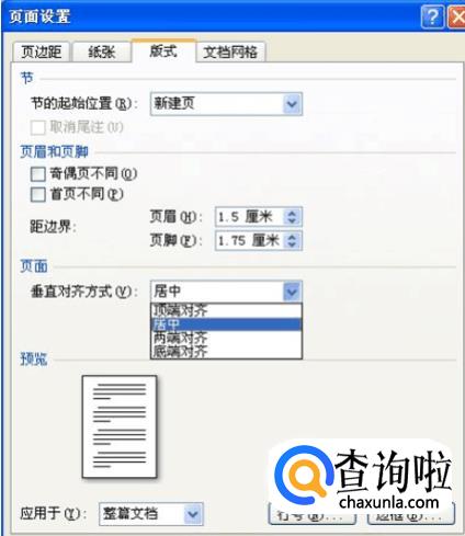 弹出页面设置对话框,选择版式选项卡,在垂直对方方式处选择居中即可,如图所示。