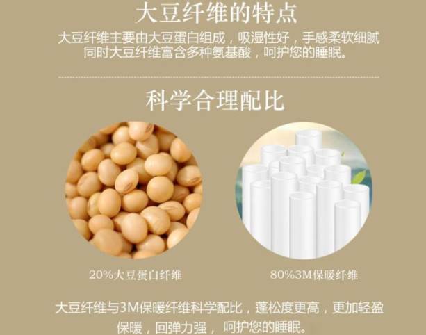 大豆蛋白纤维属于再生植物蛋白纤维类,是以榨过油的大豆豆粕为原料,利用生物工程技术,提取出豆粕中的球蛋白,通过添加功能性助剂,与腈基、羟基等高聚物接枝、共聚、共混,制成一定浓度的蛋白质纺丝液,改变蛋白质空间结构,经湿法纺丝而成。所以严格意义上来说也可以算作是化纤被。且大都和中空涤纶纤维混合填充,大豆纤维被只是噱头。