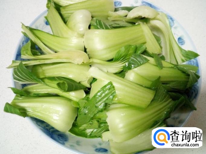 把油菜放入热水锅中汆一下,再用凉水过一下,控干水分,备用。