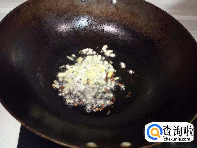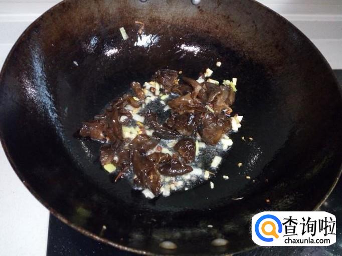 锅内放油加热,油热后放入花椒,葱,姜,蒜,爆锅,放入木耳翻炒。