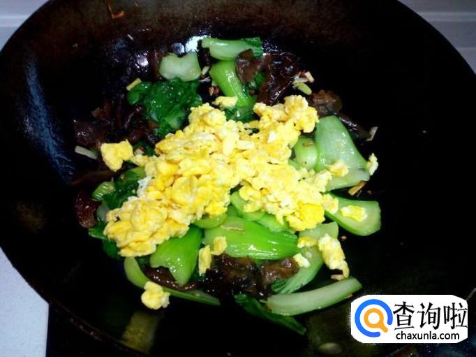 木耳炒变软后,放入油菜,少许料酒,盐,翻炒。炒至断生,放入鸡蛋略翻一下,放入味精,关火。滴少许芝麻油,出勺。