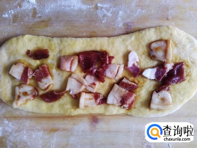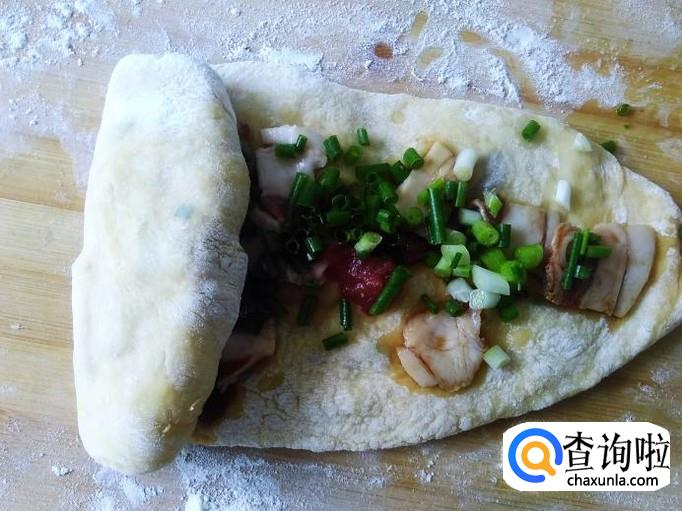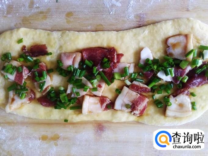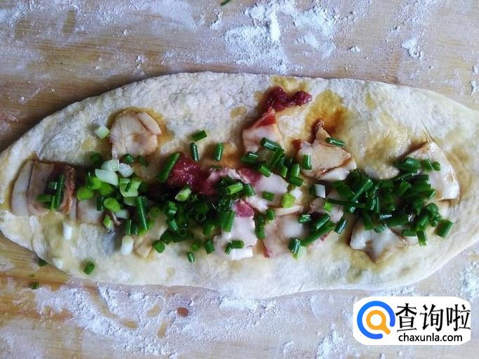 压成长饼,然后把腌制好的猪肉均匀地铺在上面。