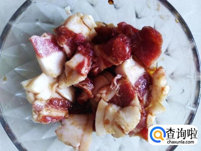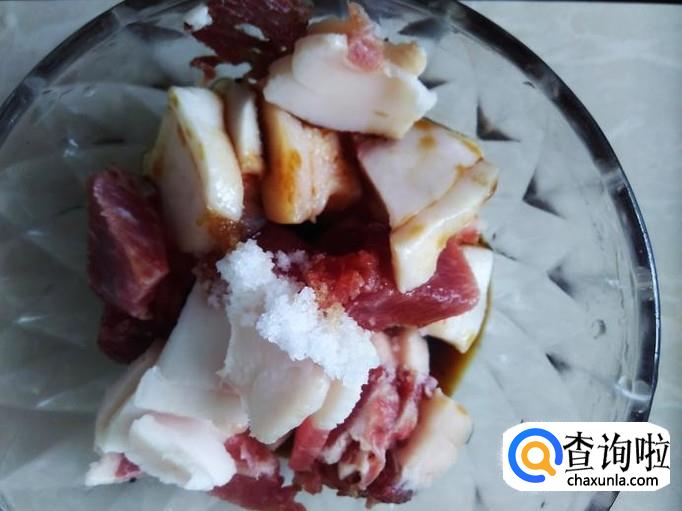 猪肉切成小薄片,加适量的盐、1勺生抽腌制几分钟。