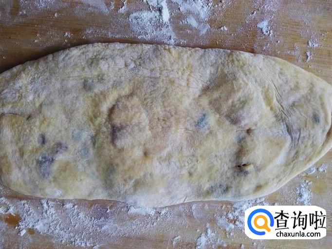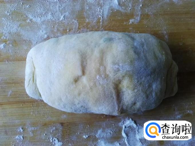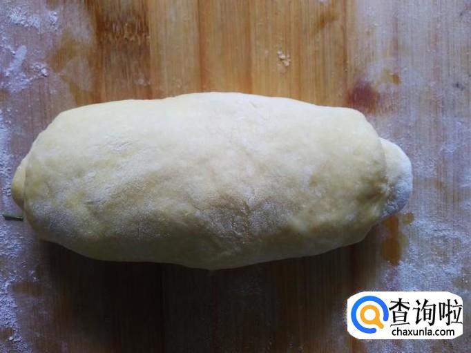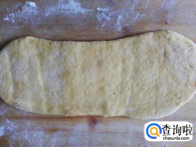 面团发酵2个小时后,变成两倍大,然后再撒点面粉搓揉成长粗条。