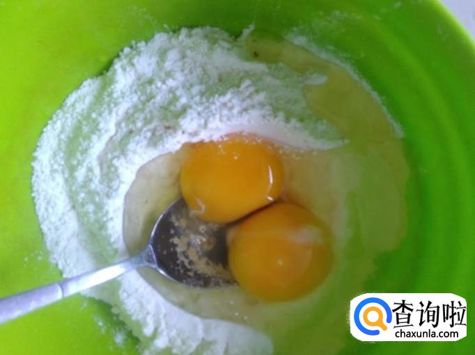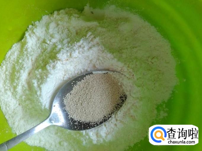首先把面粉放置盘子,加酵母【按说明下料】再加2个鸡蛋,适量的盐。