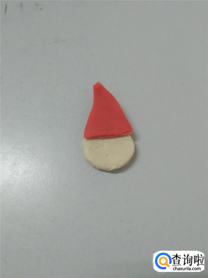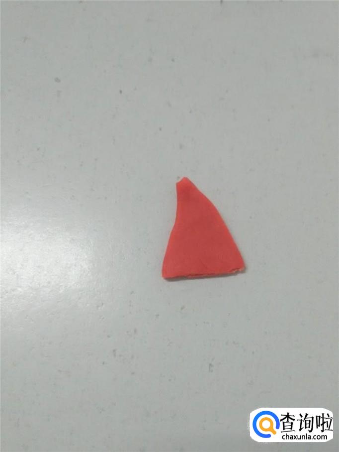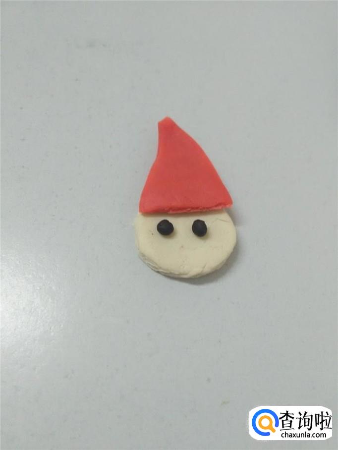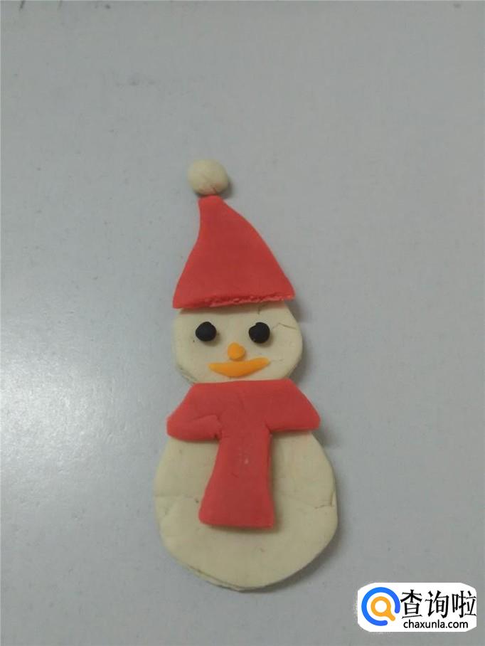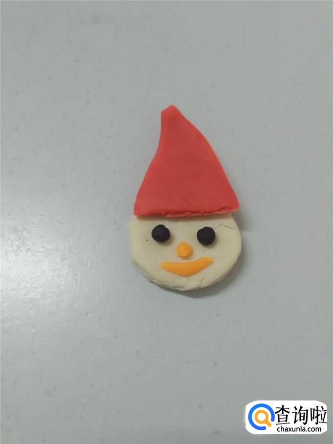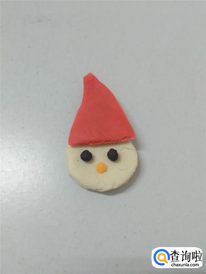 用红色捏一个三角形,尖部稍稍弯一些,粘在雪人的头上,当作圣诞帽。